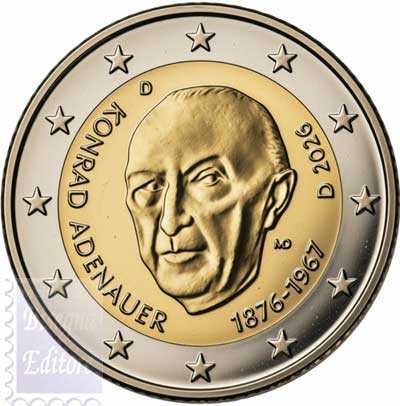 Per celebrare il 150° anniversario della nascita di Konrad Adenauer nel 2026, la moneta commemorativa da 2 euro rende omaggio allo statista tedesco e primo cancelliere della Repubblica Federale di Germania. Il progetto dell'artista e scultrice Marianne Dietz raffigura un ritratto di tre quarti di Konrad Adenauer, il cui 150° compleanno sarà celebrato nel 2026. L'esecuzione artistica del ritratto colpisce per la sua raffinata modellazione e la grande espressività, e quindi per l'elevato valore di riconoscimento. Tiratura 30.150.000 esemplari UNC per complessive 5 zecche di Germania A/D/F/G/J