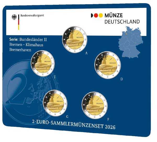La nuova moneta da 2 euro della Germania per il 2026 dedicata a Brema è la quarta emissione della seconda serie dedicata ai Länder tedeschi (Bundesländer II). Ecco i dettagli principali: Soggetto: La moneta raffigura il Klimahaus Bremerhaven 8° Ost, un celebre centro scientifico interattivo situato a Bremerhaven che esplora le zone climatiche della Terra lungo l'8° meridiano est. Design: Creato dall'artista Bodo Broschat (le cui iniziali "BB" appaiono sulla moneta), il disegno mostra il caratteristico edificio del Klimahaus con elementi che simboleggiano la diversità climatica globale. Emissione: La data di uscita ufficiale è il 29 gennaio 2026. Tiratura: Prevista in circa 30 milioni di esemplari, distribuiti tra le cinque zecche tedesche identificate dalle lettere A (Berlino), D (Monaco), F (Stoccarda), G (Karlsruhe) e J (Amburgo). Contorno: Zigrinato con l'iscrizione tipica delle monete tedesche: "EINIGKEIT UND RECHT UND FREIHEIT" (Unità, Giustizia e Libertà). Tiratura 15.000 coincard BU