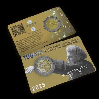 nuovo 2 euro 2025 emesso e messo in circolazione mercoledì5 10 settembre dedicata al "Centenario della nascita di Mikis Theodorakis", compositore greco noto sia per la sua musica che per il suo attivismo politico. Tiratura 5.000 coincard BU