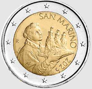 Moneta da 2 euro San Marino Fior di conio - Le rinnovate facce nazionali degli euro sammarinesi rappresentano opere d’arte e monumenti della Repubblica quali il ritratto del Santo Marino, particolare di un dipinto di Giovanni Battista Urbinelli il santo patrono che regge la Repubblica sulla bimetallica da 2 euro. Tiratura 600.000 esemplari