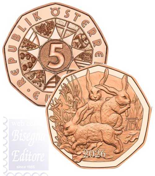 • 5 € Austria 2026 - Pasqua 2026 - i tre coniglietti di Dürer