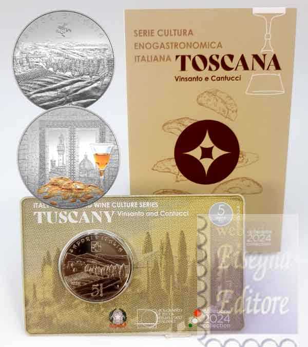 Mentre le maestose architetture della Cupola del Brunelleschi, del campanile di Giotto e della Torre di Arnolfo di Palazzo Vecchio si fondono armoniosamente con il suggestivo paesaggio delle colline senesi, in primo piano, i tipici cantucci e il Vin Santo toscano. Dritto: In primo piano, i tipici cantucci e il Vinsanto toscani. Sullo sfondo, tarsie in marmo bicromatiche, tipiche del romanico toscano, che delimitano una finestra, con decori ispirati alla facciata dell’Abbazia di San Miniato al Monte di Firenze, da cui si scorge la cupola di Brunelleschi del Duomo di Firenze, il Campanile di Giotto e la Torre di Arnolfo di Palazzo Vecchio. A sinistra, in verticale, le scritte “TOSCANA” e “REPUBBLICA”; in alto, “ITALIANA”; in esergo, la firma dell’autore M .BONIFACIO. Moneta con elementi colorati. Rovescio: In primo piano il caratteristico paesaggio delle colline senesi; sullo sfondo, distese di vigneti, coronati da cipressi, e il litorale toscano sul mar Tirreno; in alto, al centro, il cavallo alato Pegaso, inserito in uno scudo sannitico, simbolo della Regione Toscana. Ad arco, in alto, la scritta “SAPORI D’ITALIA”; al centro, in basso, il valore “5 EURO”; a destra, “R”, identificativo della Zecca di Roma, a sinistra, “2024”, anno di emissione. Tiratura 7.000 esemplari