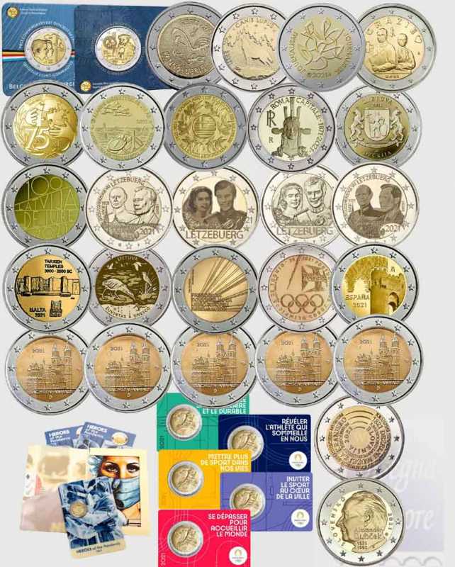Collezione completa di tutti i 2 euro commemorativi emessi nell' anno 2021 Fior di conio, comprese le 2 coincard del Belgio + le 5 coincard di Francia (5 colori diversi) , la coincard Malta Pro-Covid19 e le 5 Zecche di Germania ( esclusi Vaticano, San Marino, Monaco ed Andorra )