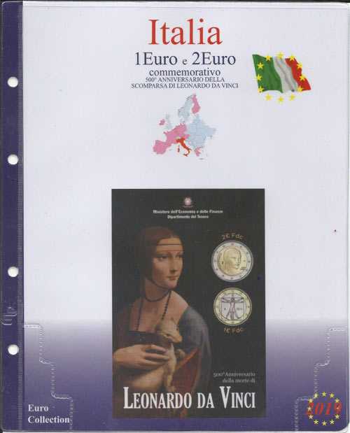 Pagina raccoglitrice plastificata contenente 1 taschina alloggiamento per il folder Collezione 2019 Italia 500° Ann. della scomparsa di Leonardo da Vinci.