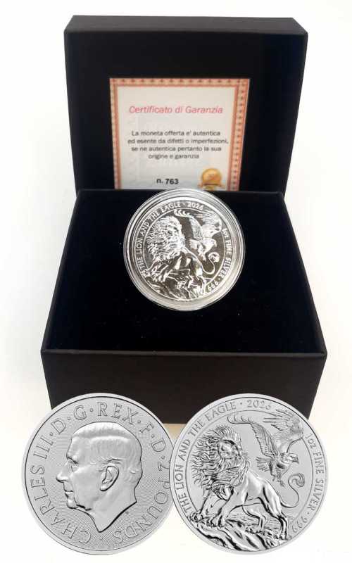 • Moneta 2£ Il Leone e l'Aquila 2026 - Confezione in scatola e ns. certificato- 1 oncia Argento 999 BU (31,10 g)