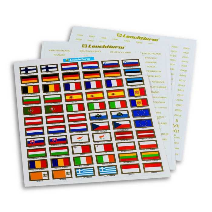 Serie di etichette autoadesive per personalizzare fogli portamonete neutri e pagine generiche per tutti i Paesi dell'eurozona nonchè per le zecche tedesche, cifre per i volumi (I-XII), e le annate (1999-2024). Serie delle bandiere dei 24 Paesi dell'eurozona, dei piccoli Stati di San Marino, Vaticano, Principato di Monaco e Andorra nonchè 2 bandiere dell'Europa. Cod 321.082
